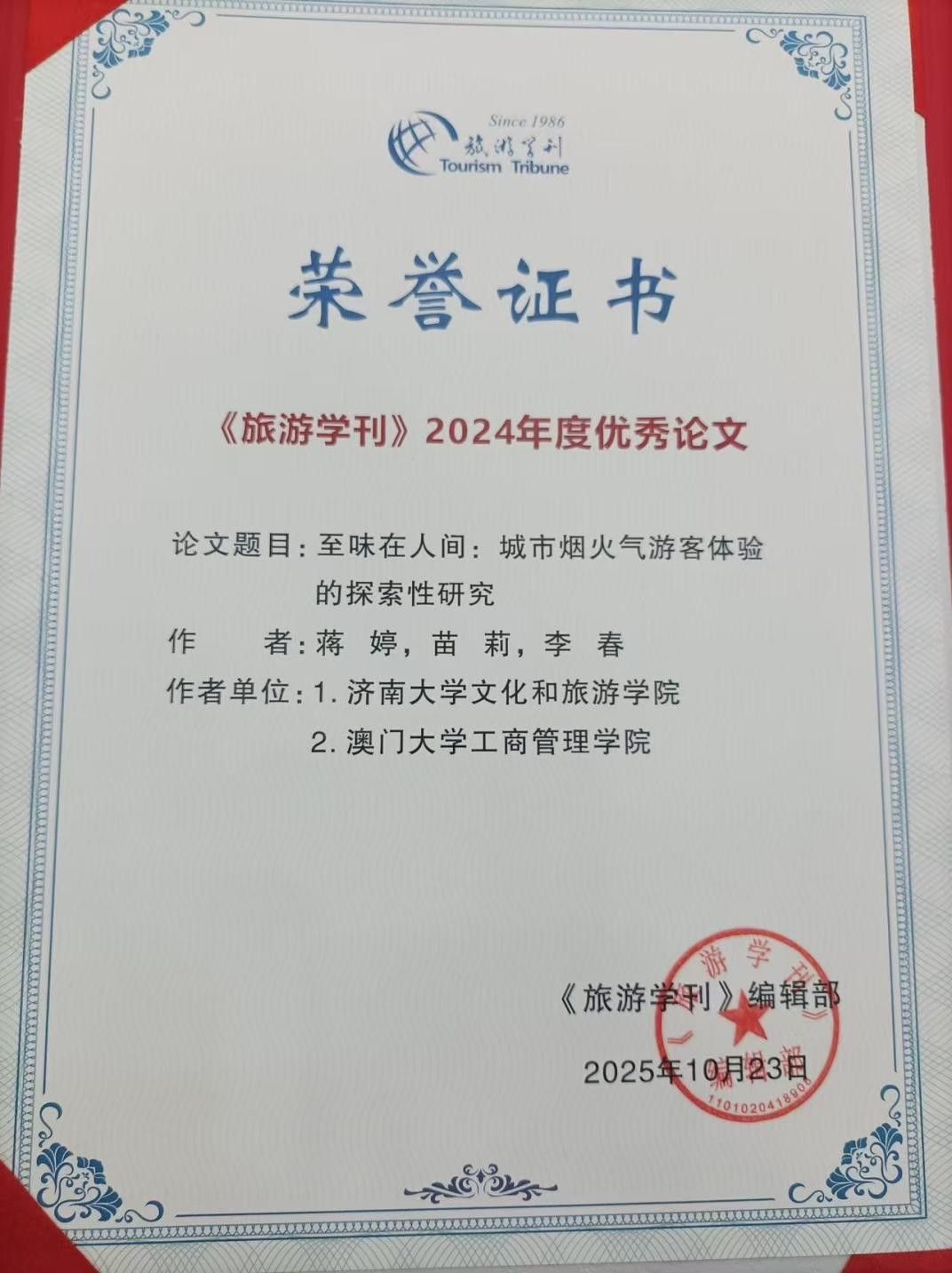 近日,在西安结束的2025《旅游学刊》中国旅游研究年会上,由编委组成的论文评审委员会多轮评选,遴选出2024年《旅游学刊》年度优秀论文10篇。Beat365官网蒋婷教授和其研究团队撰写的论文《至味在人间:城市烟火气游客体验的探索性研究》,被评为2024《旅游学刊》年度优秀论文。