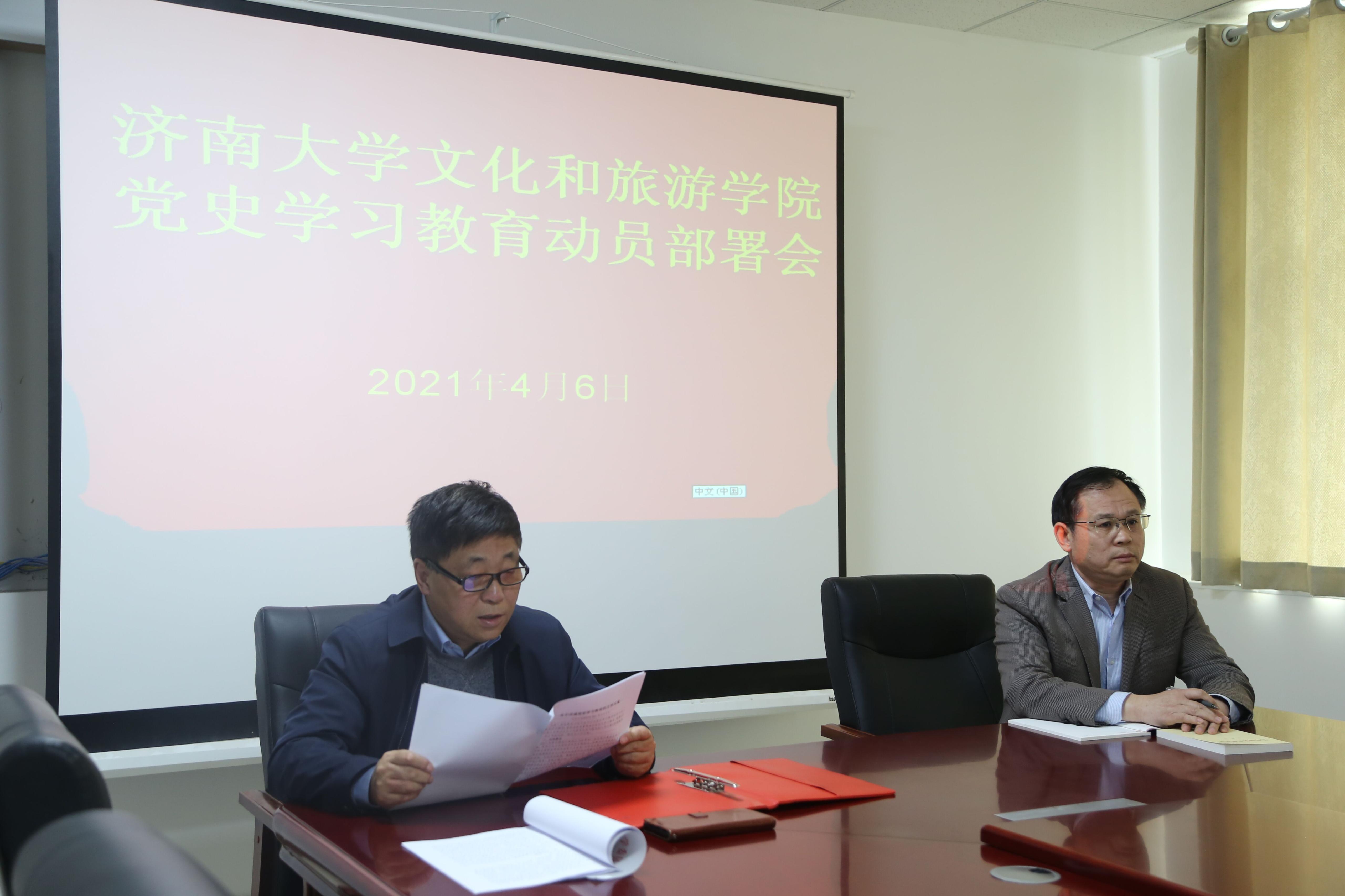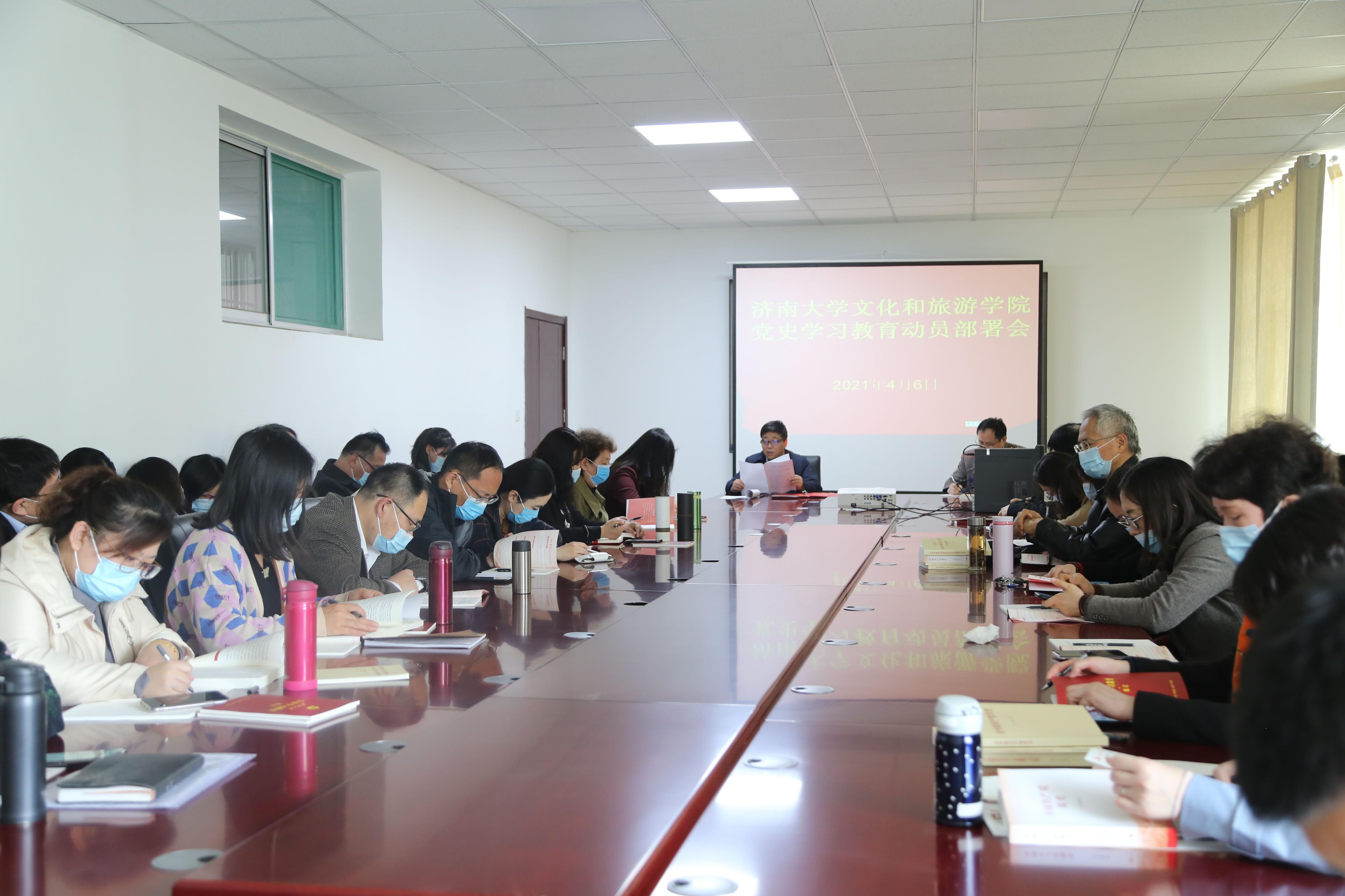 为深入贯彻落实习近平总书记在党史教育动员大会上重要讲话的精神,Beat365唯一官方网站根据学校党史学习教育工作的总体要求,于2021年4月6日下午两点半在济南大学舜耕校区文旅楼212会议室举行“党史学习教育”动员部署会。会议由学院党委书记朱海涛主持,院长刘建波和全体教工党员参加。