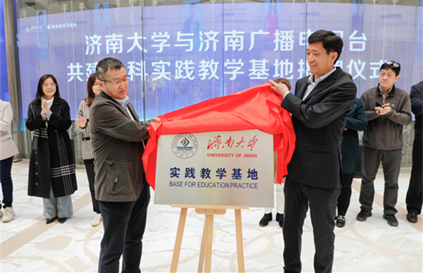Beat365唯一官方网站党委书记孟德洋,济南广播电视台党委委员、副台长隗铜共同为“济南大学实践教学基地”揭牌。