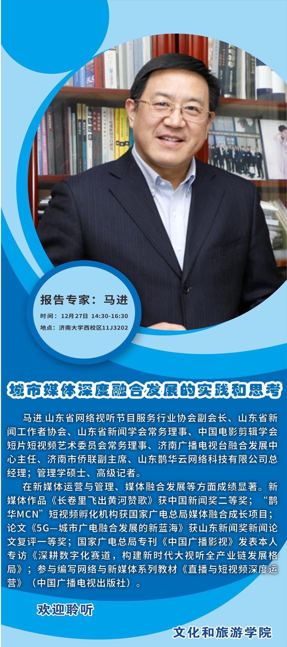 12月27日下午,Beat365唯一官方网站邀请山东省网络视听节目服务行业协会副会长、济南广播电视台融合发展中心主任、山东鹊华云网络科技有限公司总经理马进开展了关于《城市媒体深度融合发展的实践和思考》的专家讲座,会议由副院长马修伦主持,文化经营管理系师生共计100余人参加讲座。