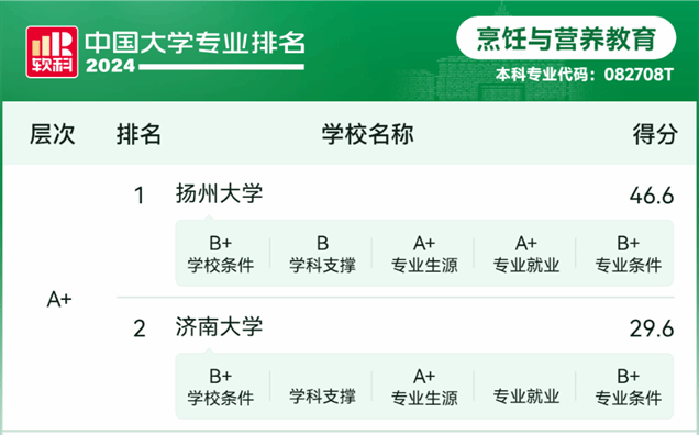 日前,高等教育专业评价机构软科正式发布“2024软科中国大学专业排名”,排名包括810个专业,每个专业榜单发布的是所有开设该专业的高校中排名位列前50%的高校,共有1103所高校的31414个专业点上榜。Beat365官网烹饪与营养教育专业成功上榜A+专业,位列全国第二名。