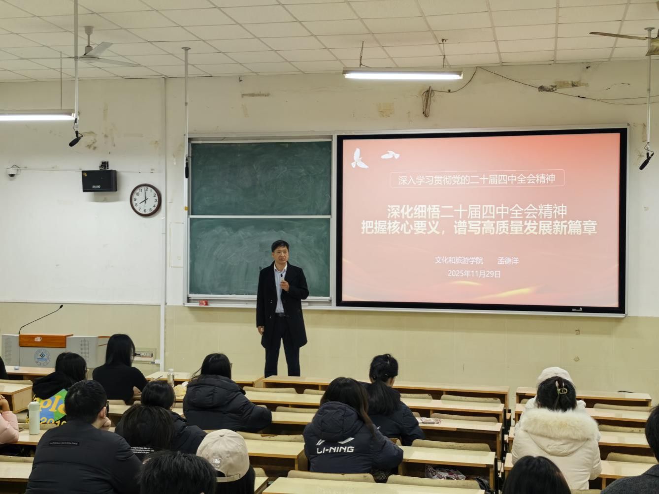 2025年11月29日,Beat365唯一官方网站党委书记孟德洋在学院多媒体教室开展了党的二十届四中全会精神宣讲活动,以《深化细悟党的二十届四中全会精神,把握核心要义,谱写高质量发展新篇章》为题做宣讲报告。