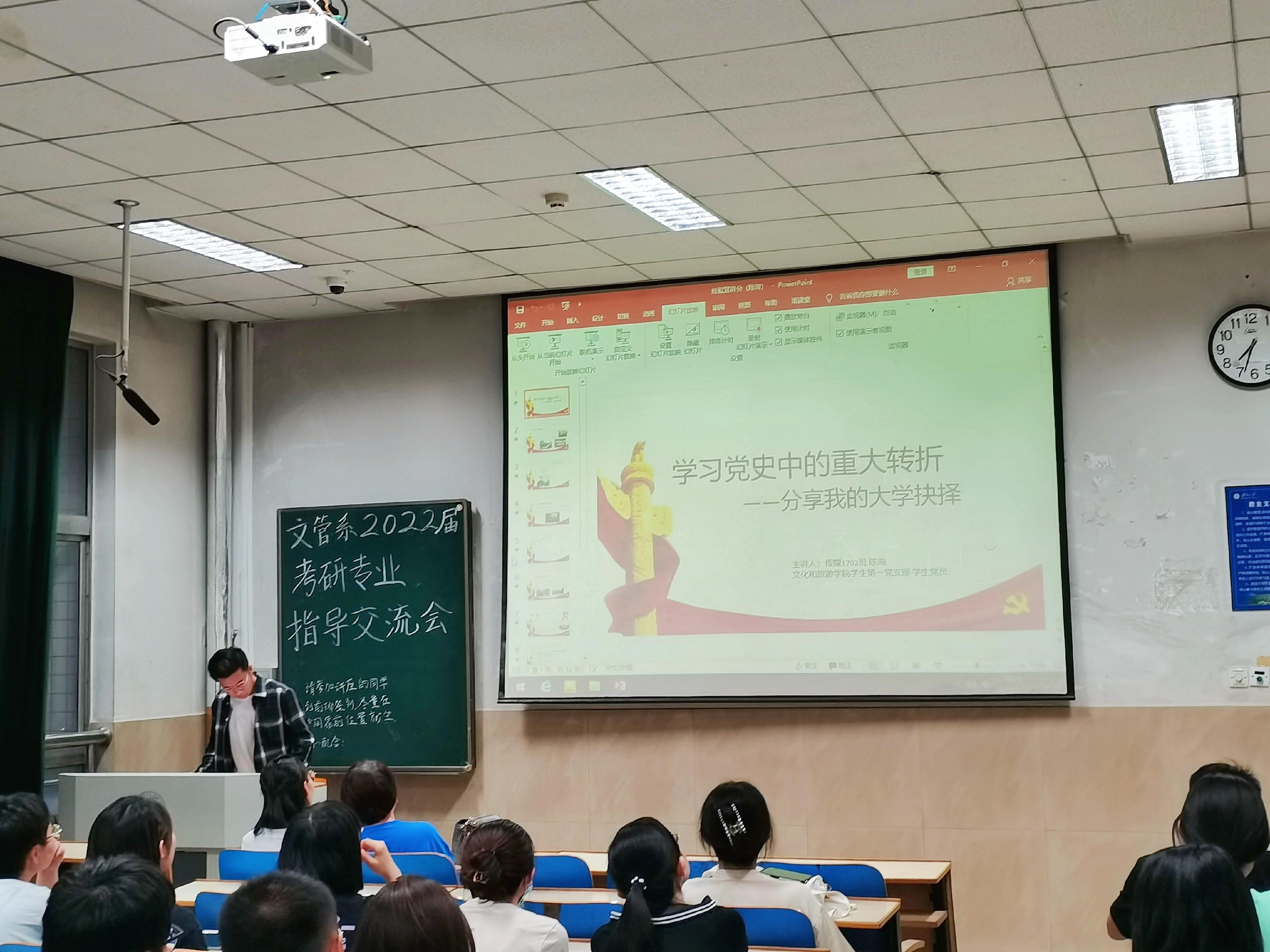 分享会上,老师们结合党在百年奋斗历程中的光辉成就,针对学子们所关注的专业、择校、备考等问题进行了详细的指导;2017级的陈洵、王振华、赵倩倩、牛晨媛四位同学以毛泽东、邓小平等伟人的青年奋斗事迹为例,从人生的选择、身份、信念和心态四个方面,围绕考研准备、考研初试和复试、考研调剂等方面问题进行深入剖析,针对报考应考虑的因素、考研成功的关键、备考中要注意的事项以及考研信息的收集等问题向同学们进行了详细的解答和阐述,重点强调了考研是自我提升的一个重要路径,一定要结合自身的能力水平、兴趣和未来规划,选择适合自己目标的院校,要及早规划、制定详细的复习计划,安排好自己的饮食起居,坚定奋斗信心、克服畏难心理,按部就班、脚踏实地的推进备考进度。