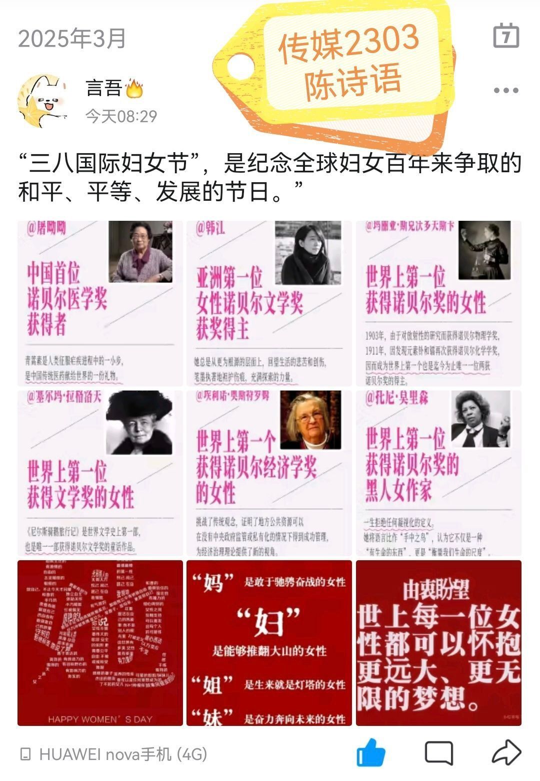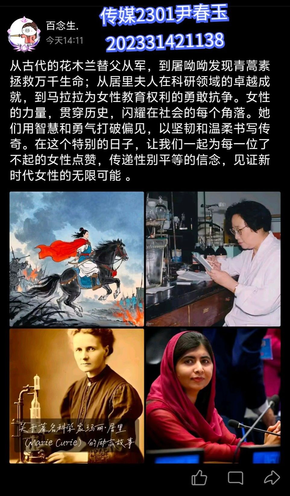 此次活动充分利用社交媒体互动性强、传播范围广的特点,鼓励全体学生在朋友圈、QQ空间、微博、短视频平台等渠道,发布鼓舞、赞誉女性的原创图文。同学们积极响应,深挖女性在历史演进、社会进步、科技创新等不同领域的卓越成就,从古代的巾帼英雄到当今的科研先锋,用青年特有的视角与表达方式,展现“她力量”的熠熠光辉。
