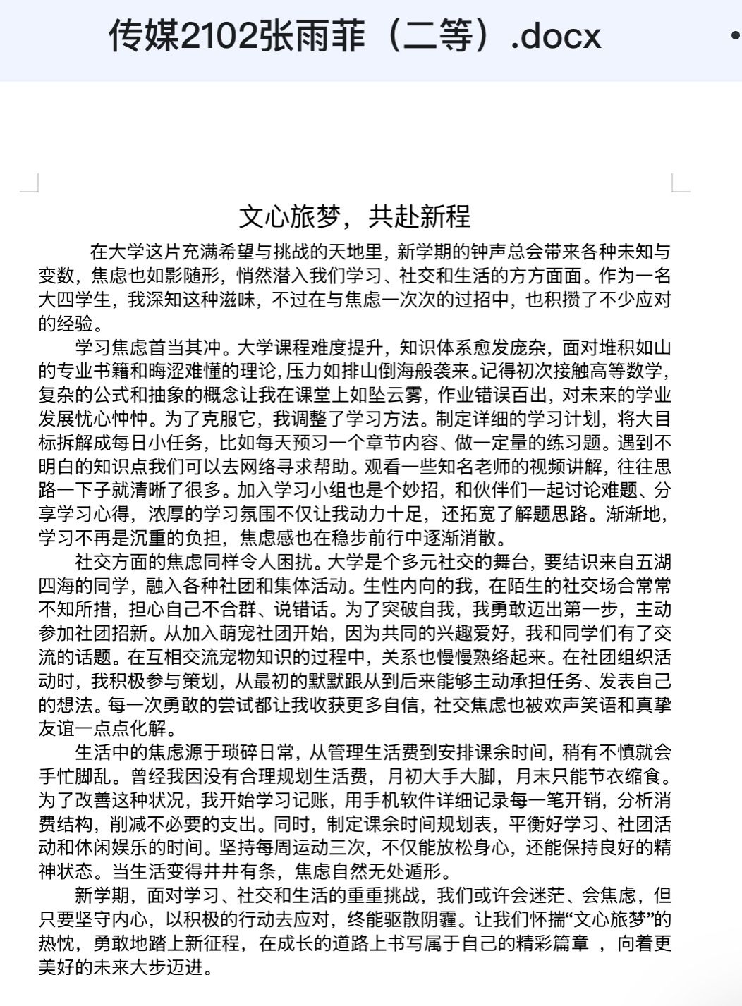 活动于 2025 年 3 月 3 日正式启动,采用线上举办的形式。同学们在得知活动通知后,踊跃加入官方群上传作品。本次征文活动主题为 “文心旅梦,共赴新程”,鼓励同学们分享新学期在学习、社交、生活等方面的焦虑,或是对学期末的目标期望、解决问题的经验。
