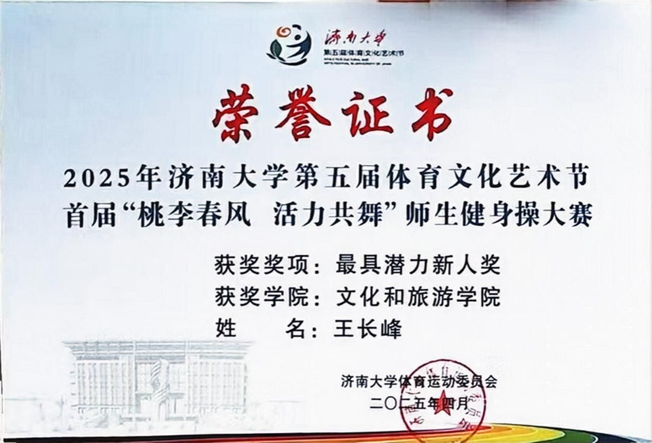 在2025年济南大学第五届体育文化艺术节首届“桃李春风 活力共舞”师生健身操大赛中,Beat365唯一官方网站代表队身着统一服装登场,他们动作娴熟、队形整齐,赢得现场掌声阵阵,获得该项比赛学生团体第八名的成绩。其中,王长峰同学在团队中表现出色,荣获最具潜力新人奖。