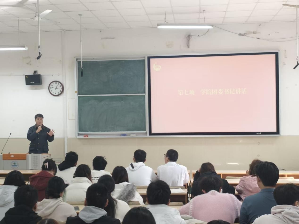 随后,学院团委书记赵军讲话。他指出,经济领域有“先富带动后富”,思想领域则需“先进引领后进”,团员正是凝聚青年思想的先进力量——从当年穿着破旧衣物研发战机的罗阳,到如今攻关航天、军工领域的青年团队,国家发展始终需要有理想的青年作为中流砥柱。他强调,入团不是小事,而是选择了指导思想与政治立场,“思想”这颗种子会潜移默化影响个人的未来职业与人生选择,让个人奋斗与国家发展同频共振。他勉励新团员以入团为里程碑,在思想上不松懈,在生活中勇担责任,在实干中锤炼自我,让青春与时代同行。
