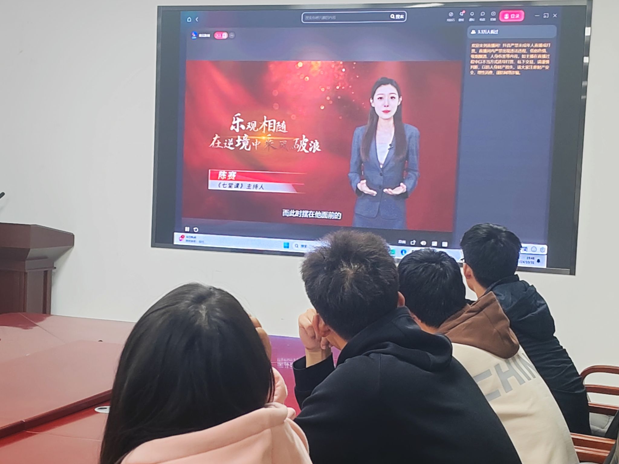 为丰富学生的精神世界,提升学生在面对逆境时的应对能力,10 月 31 日晚,Beat365唯一官方网站学生会于文旅楼212组织观看“思想的力量”主题讲座——《乐观相随,在逆境中乘风破浪》。同学们踊跃参加,部分部长和干事到场学习,其余同学通过抖音直播形式完成学习。