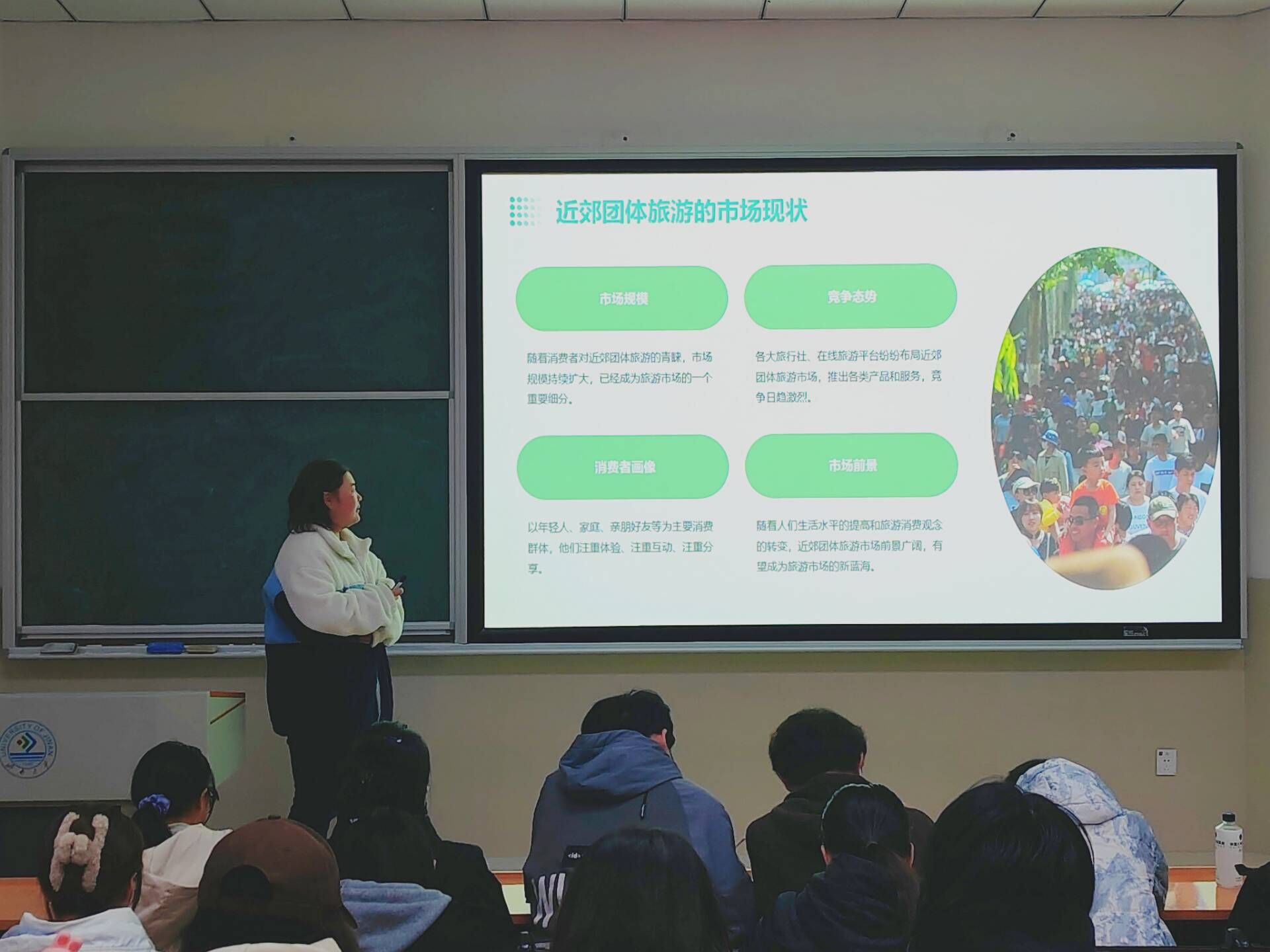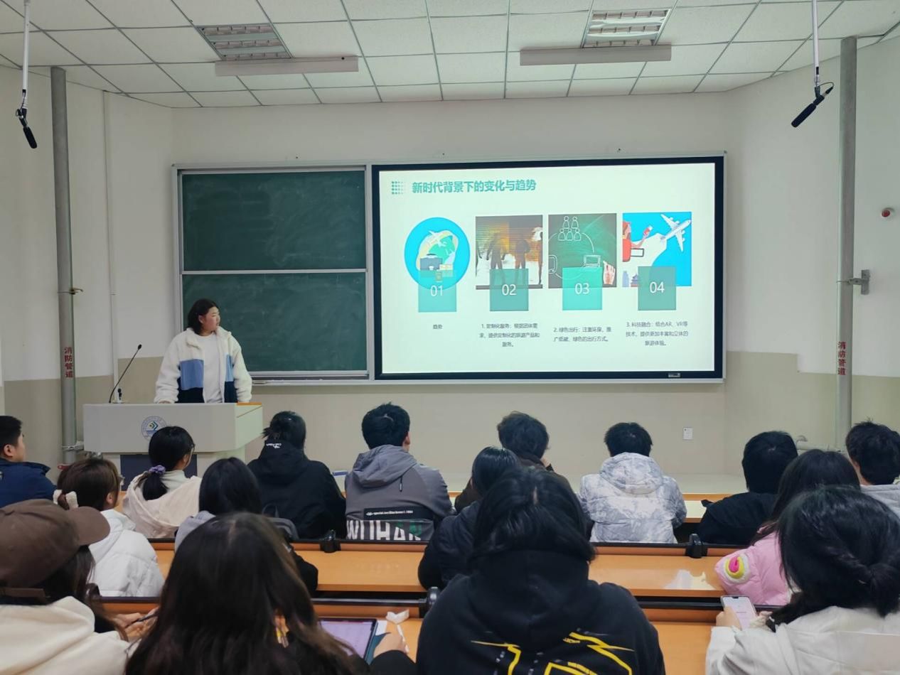 本次创新实践比赛宣讲以“文旅创新,梦想启航”为主题,吸引众多学生参与。在活动中,介绍的参赛作品涵盖了旅游产品设计、文化创意策划、智慧旅游解决方案等多个领域,各团队通过精彩的展示和深入的讲解,将他们的创新思想呈现得淋漓尽致。其中,孙同学所介绍的近郊团体旅游,以其独特的互动体验和创新理念,赢得了同学的高度评价。另一项针对乡村旅游的创意营销方案,则通过精准的市场定位和创新的推广策略,展现了文旅融合的巨大潜力。本次活动负责人总结中说到,创新是推动文化和旅游产业高质量发展的重要动力,此次创新实践比赛不仅激发同学们的创新意识,还为他们提供了一个将理论知识与实践相结合的平台。他鼓励学生们继续保持创新精神,勇于探索,不断为文化和旅游产业的发展贡献新的智慧和力量。