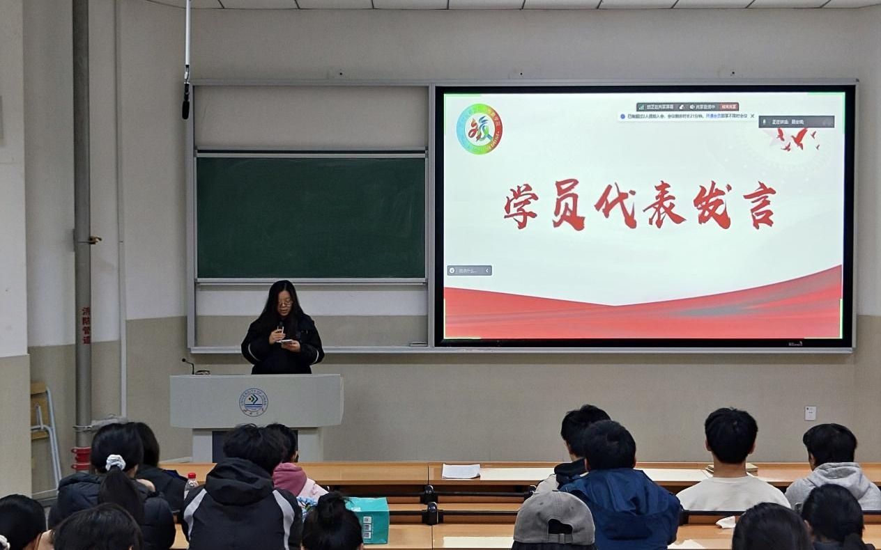会议进行到第二项议程,由青马班成员杨鑫袆作为学员代表发言。杨鑫祎同学表示,青马班不仅是一个系统培养青年马克思主义者的平台,更是个人成长和思想升华的重要契机。经过为期数月的青马课程培训,她深入学习了马克思主义基本原理以及中国近现代史、党史等,提高了政治理论水平,增强了历史使命感和责任感。她认为,作为新时代的青年,应当坚定理想信念,为社会的发展贡献青春和智慧。