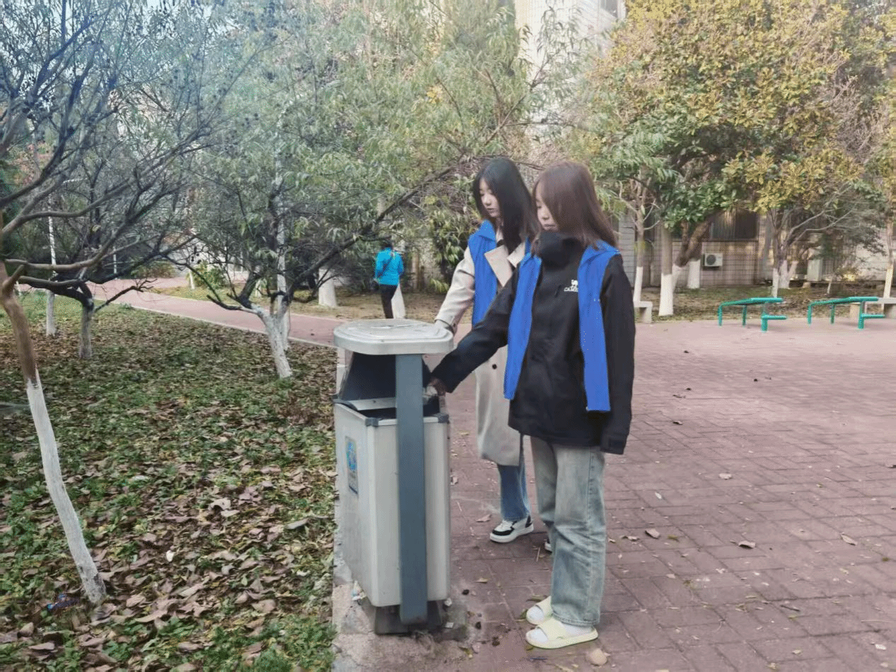 “蓝马甲们”分头行动,有人拿着长夹捡拾草丛里的烟头,有人弯腰清理长椅下的纸片,还有人推着垃圾车收集可回收物。他们的蓝色身影穿梭在教学楼前、林荫道上,与春日百花的争奇斗艳相映成趣。