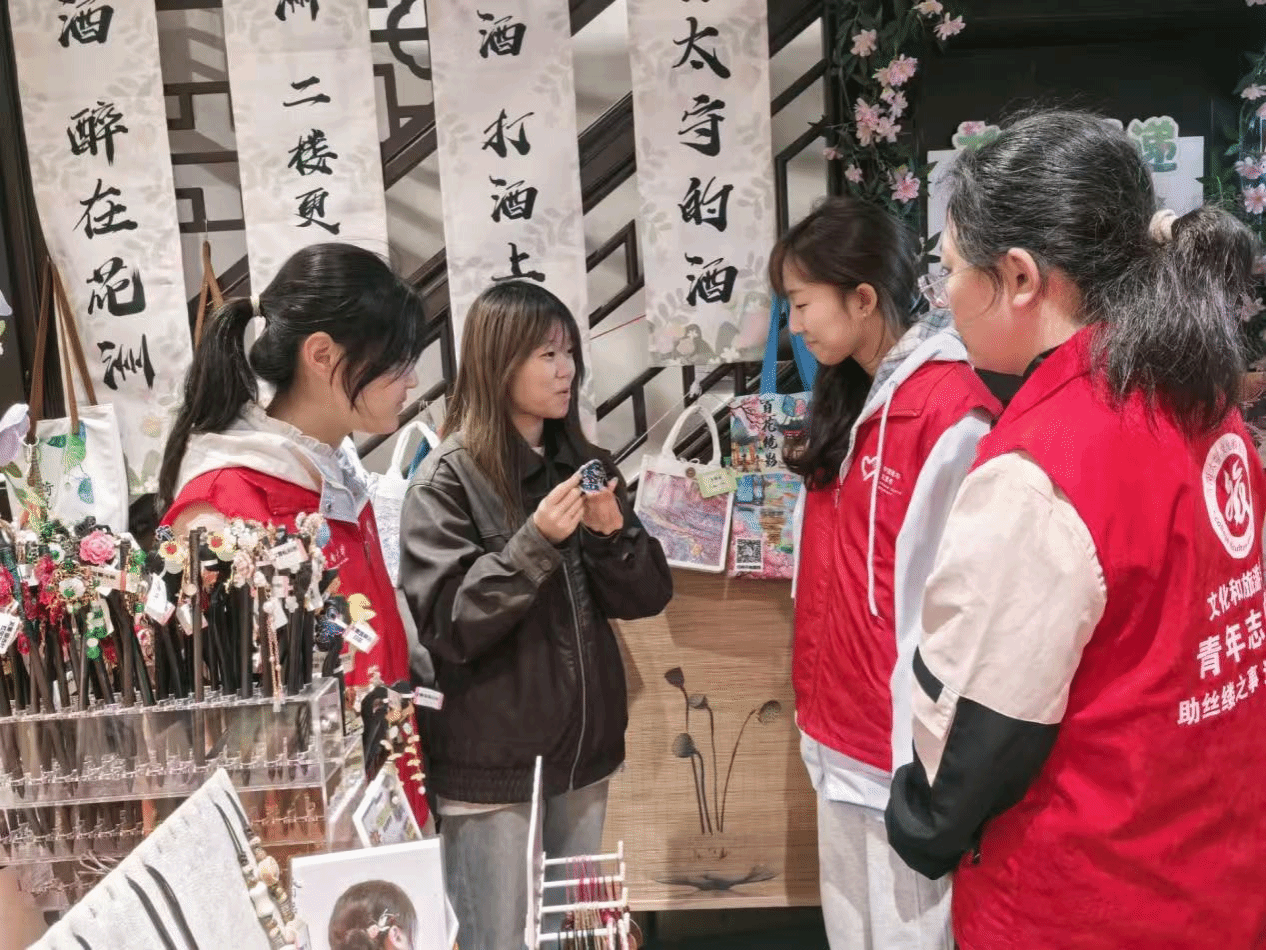 在宽厚里的非遗手作工坊中活动,“巾帼粉”成为一道亮丽的风景线。她们以“可触、可感、可带走”为特色,构建沉浸式非遗产业链体验场景。王小静同学向女性非遗传承人表达自己的观点,凸显“她经济”与非遗产业的深度耦合,推动“技艺传承——产品开发——旅游服务”全链条产业化,开发扎染汉服,摄影记录的产业服务。与此同时,其他志愿者在百花洲进行志愿服务,让“巾帼粉”也为志愿服务贡献自己一份力量。她们以细腻的视和,温暖的行动,宣传济南的百花洲景点,带着老人游玩,听老奶奶讲述她们年轻时的故事。