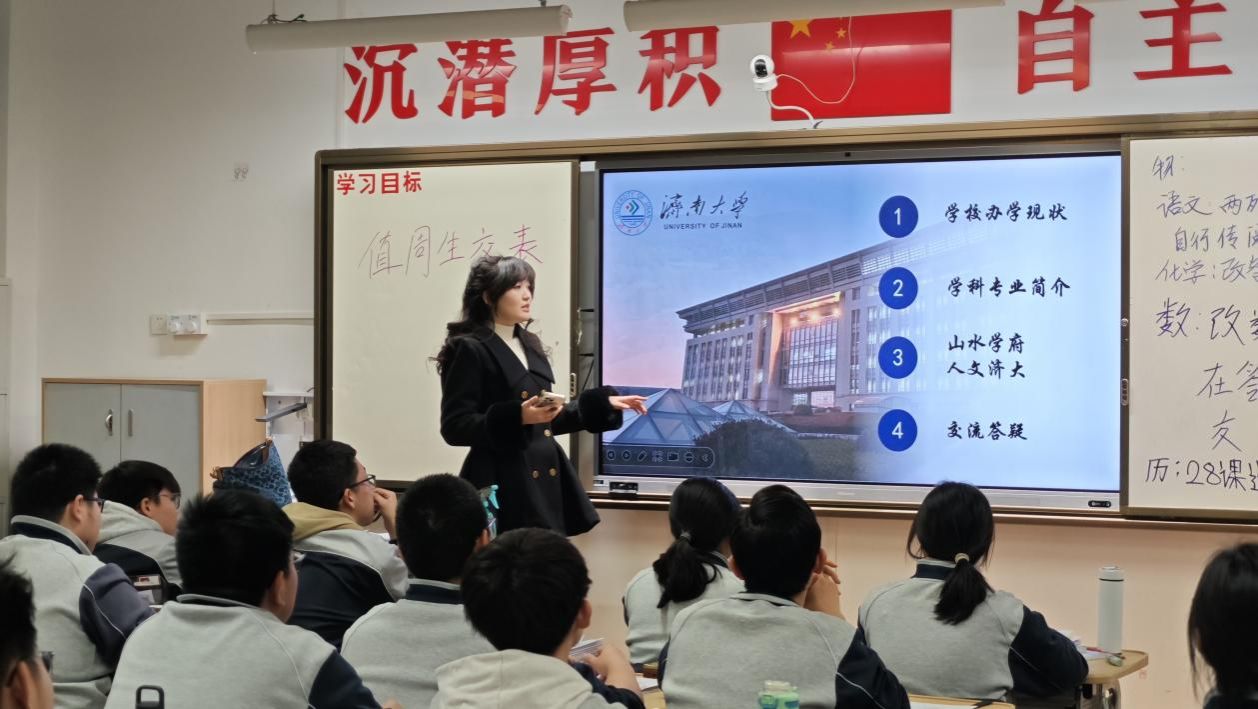 本次活动因年级而异、因需求而设。1月29日下午,侯姝君走进高一、高二年级教室,通过十五分钟的微宣讲,以自制的校园宣传视频和PPT,向学弟学妹们展示了济南大学的办学底蕴、学科实力与招生情况。她将数据融入自己的大学成长体验,分享了图书馆的伏案时光、社团活动的欢声笑语,让济大生活变得真实可感。互动环节中,她耐心解答同学们关于专业选择、校园生活的疑问,并留下联系方式以便后续交流。