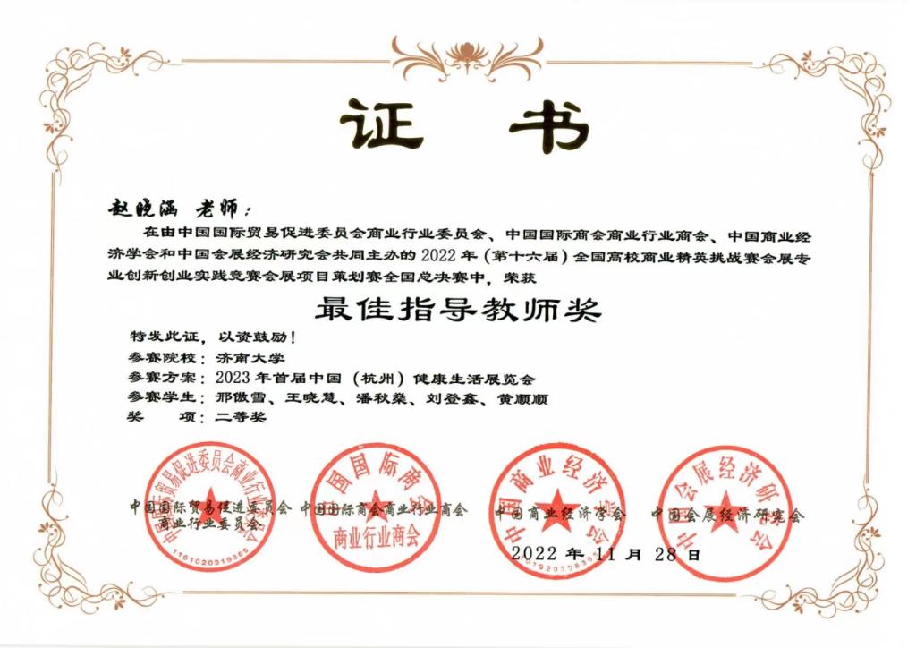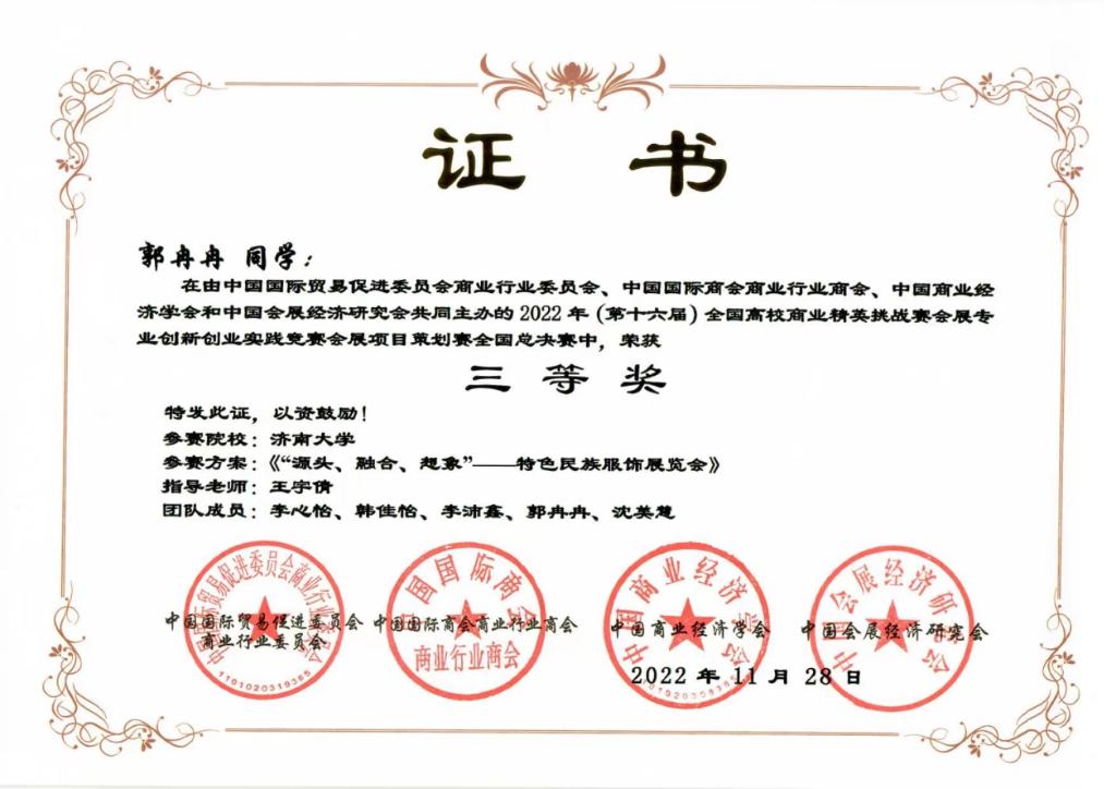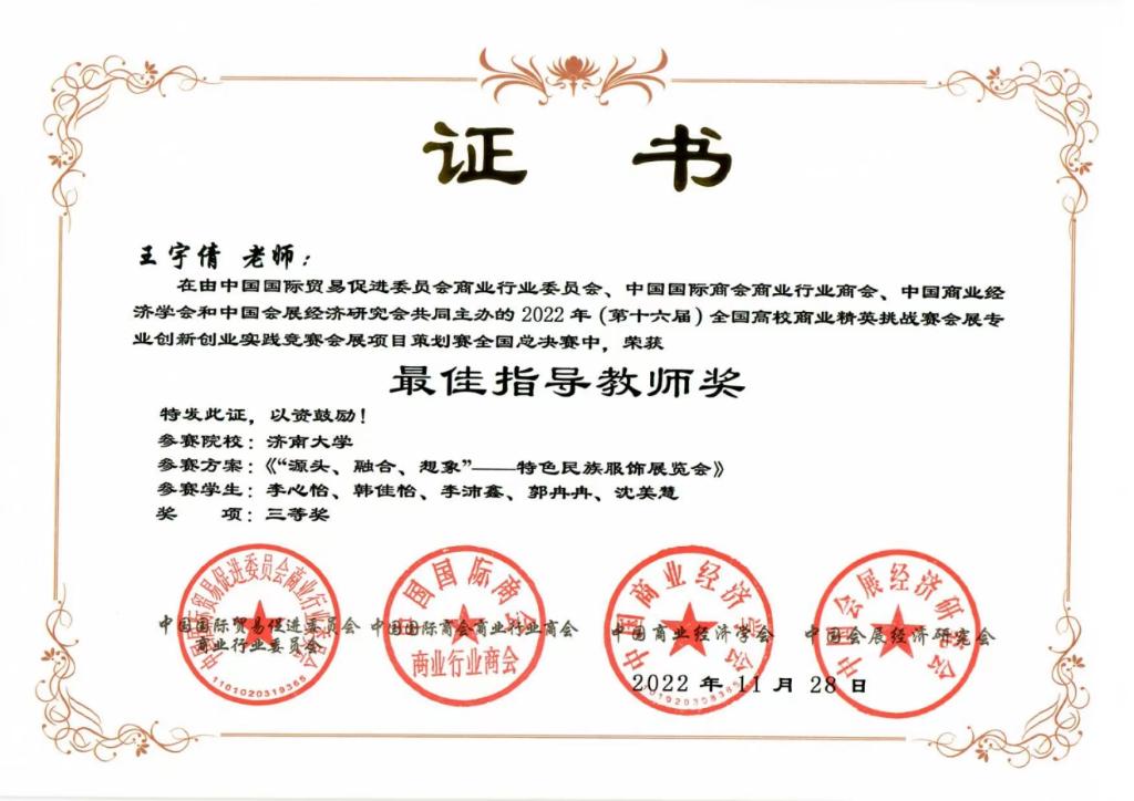 本次比赛经理论知识赛、校赛、省赛、全国赛等层层选拔,历时8个月时间。最终由学院王丽亚、赵晓涵老师指导,邢傲雪、王晓慧、潘秋燊、刘登鑫、黄顺顺等学生完成的作品“2023年首届中国(杭州)健康生活展览会”获得全国二等奖;王宇倩老师指导,李心怡、李沛鑫、韩佳怡、郭冉冉、沈美慧等学生完成的作品“‘源头、融合、想象’——特色民族服饰展览会”获得全国三等奖。