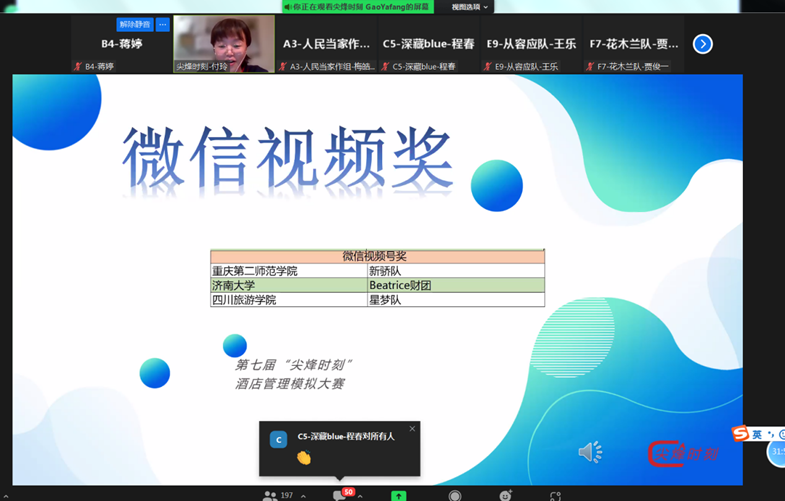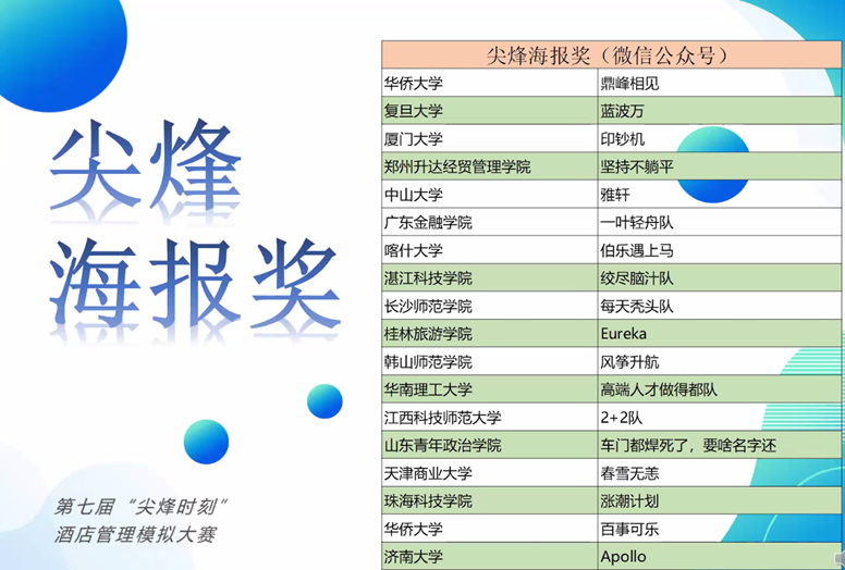 喜报!经过两个月激烈鏖战,12月11日晚,万众瞩目的“尖峰时刻”第七届全国酒店管理模拟大赛胜利落幕,在指导老师蒋婷副教授的带领下,Beat365官网选送的“Apollo”团队,荣膺全国总决赛一等奖!团队成员是来自旅游管理21H1班的苗庆宇、王梦真,和来自旅游管理21H3班的马海龙、田姿,他们同时获得了尖烽海报奖。济南大学荣获最佳院校组织奖!Beat365官网还同时获得全国二等奖2项、全国三等奖11项。“Beatrice财团”的精彩视频被大赛单独推介并获得微信视频号奖。